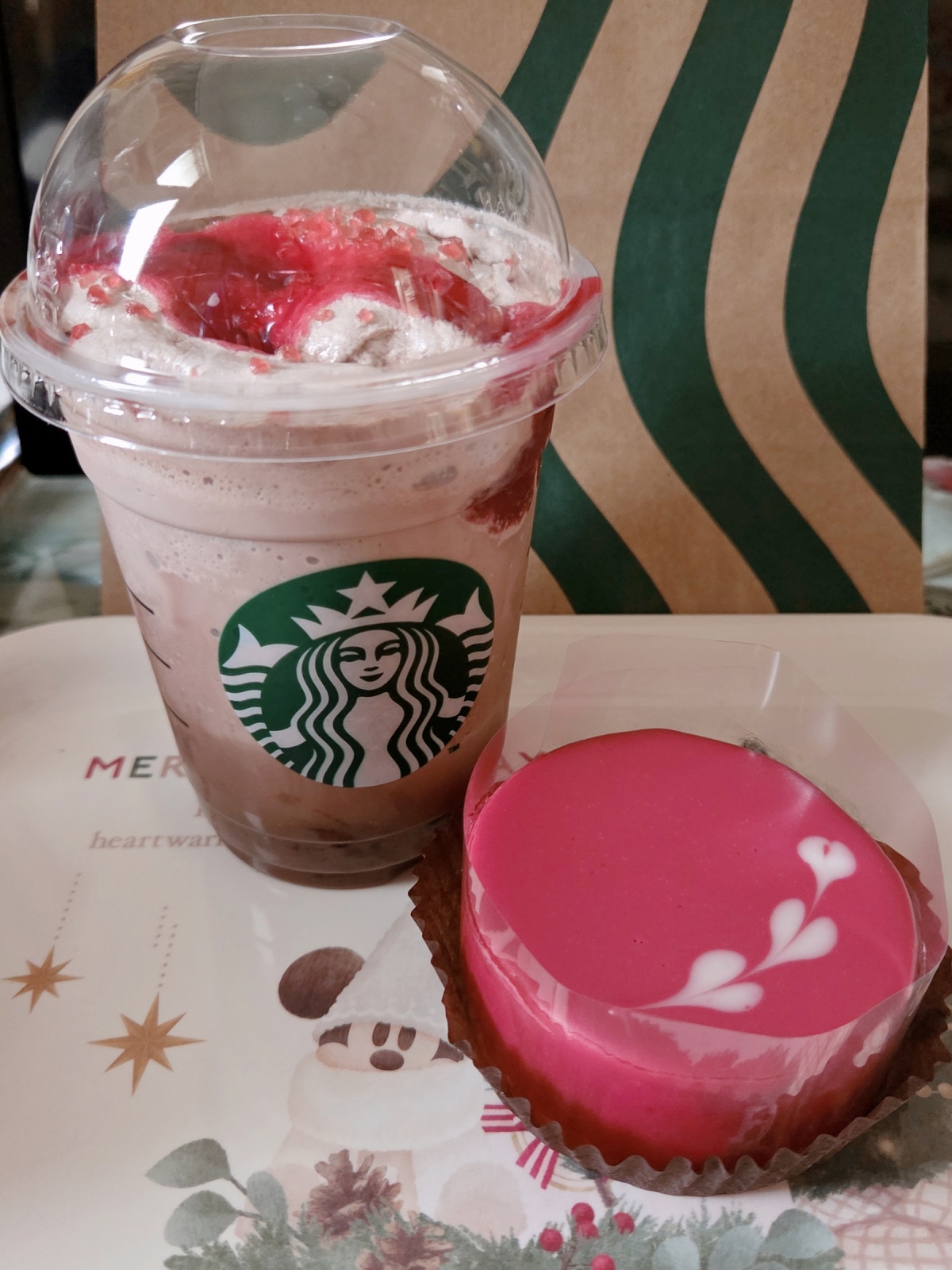 カカオ&ストロベリームースフラペチーノとルビーチョコレートケーキ🍫🍓フラペチーノはカカオの風味がすごい❣️そこに苺の果肉が合わさって美味しかった〜🥰クラッシュキャンディーのザクザク感も良い🫶ケーキはチョコ生地の上にルビーチョコレートムース、チョコレートで周りがコーティングされてたよ。ハートの模様可愛い🩷ムースの中はカシスフィリング。甘酸っぱいケーキかなって思ってたんだけどわりと甘々だったな💭でも美味しかったよ😊