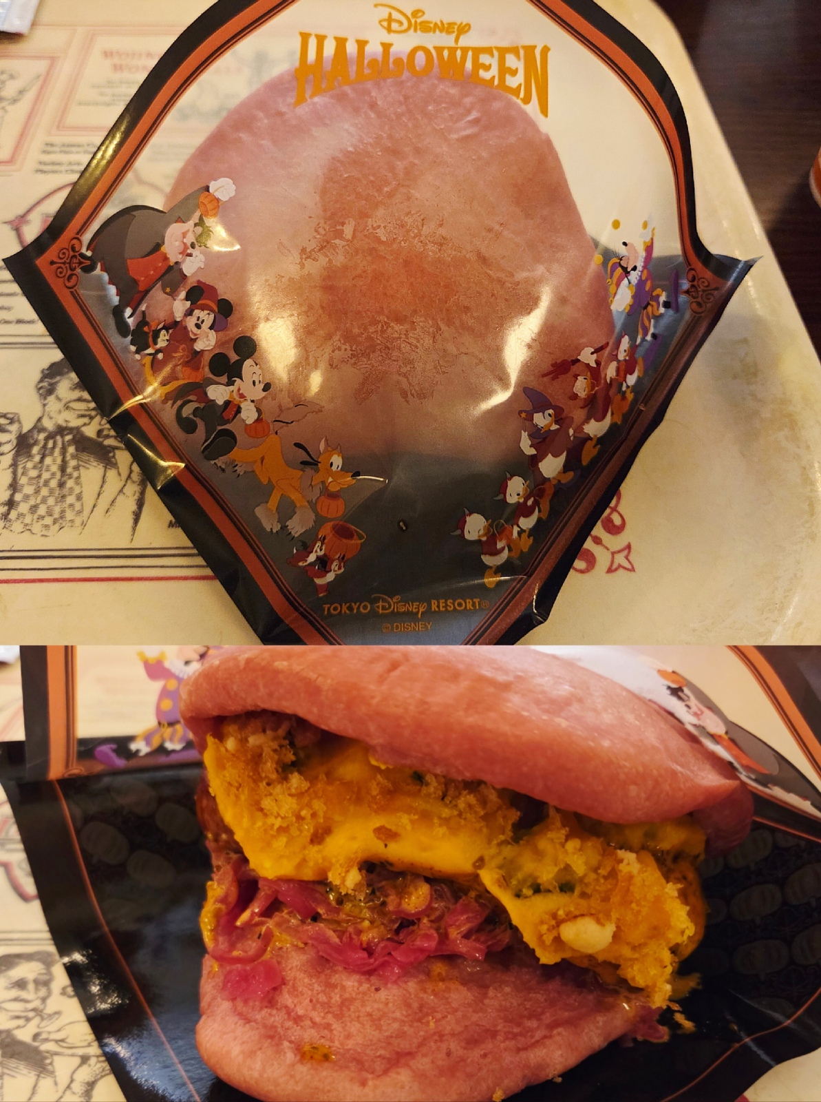 ディズニー・ハロウィーン2025。 ニューヨーク・デリで提供中のスペシャルサンド(スパイシーチキン&パンプキングラタン)🎃お目当てはこのパケだったんだけど(キャラ大集合🫶ピートやフィガロもいる)スペシャルサンドも美味しかった〜❣️紫色のバンズにラペ、スパイシーチキン、パンプキングラタンがサンドされてるんだけど甘辛のバランスが良いのとチキンのやわらかさが良かった🤗