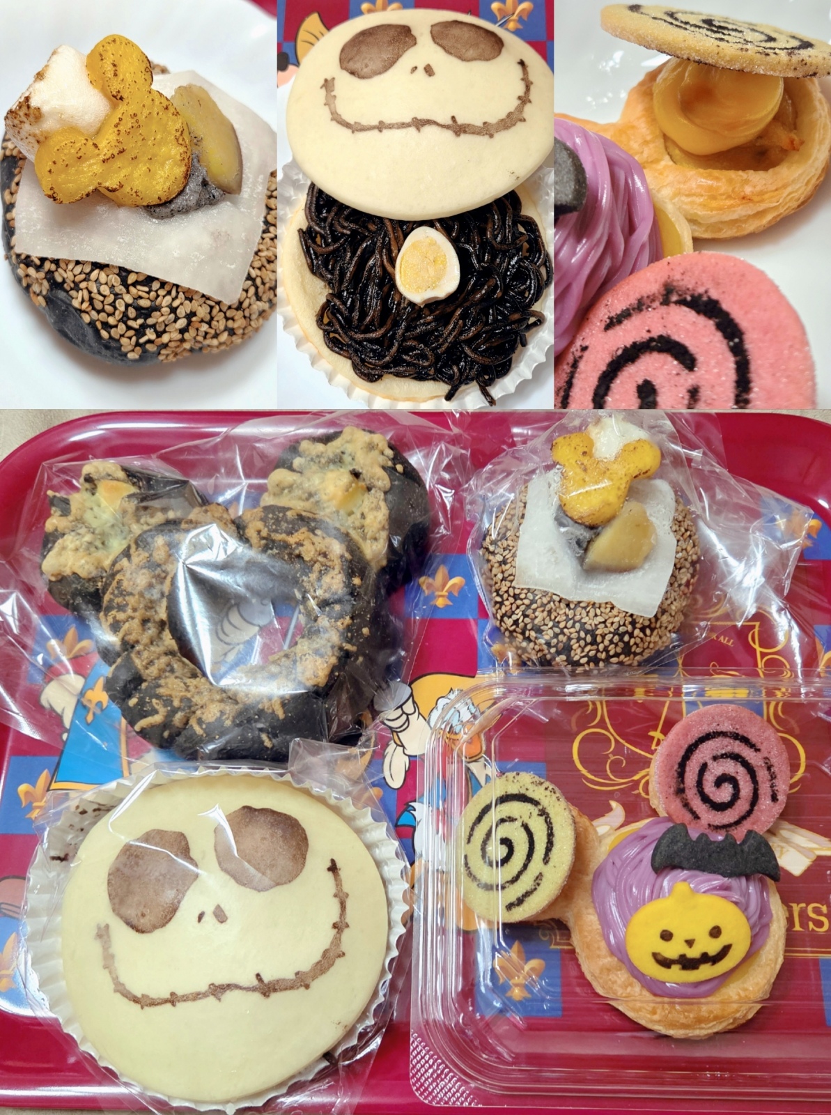 ジャックのはブラック焼きそばブレッド。焼きそばの着色は竹炭だそうで真ん中に満月をイメージしたうずらのたまごが乗ってたよ🥚お隣のポップな見た目のはパンプキンデニッシュ。耳にも顔にもクリームたっぷりなスイーツパンでした🍭その上のごまたっぷりのがこしあんブレッド。上に求肥、黒ごまのホイップ、お芋、マシュマロ、求肥は中にも入ってたよ❣️ミッキーシェイプのベーコンとチーズのブレッドはレギュラー商品のブラックver.なのかな?食べたことなかったんだけど、耳にダイスカットチーズがごろごろ入っててお顔部分に薄めのベーコンが入ってたよ。温めるとより良い😋どれも美味しかったな〜🥰