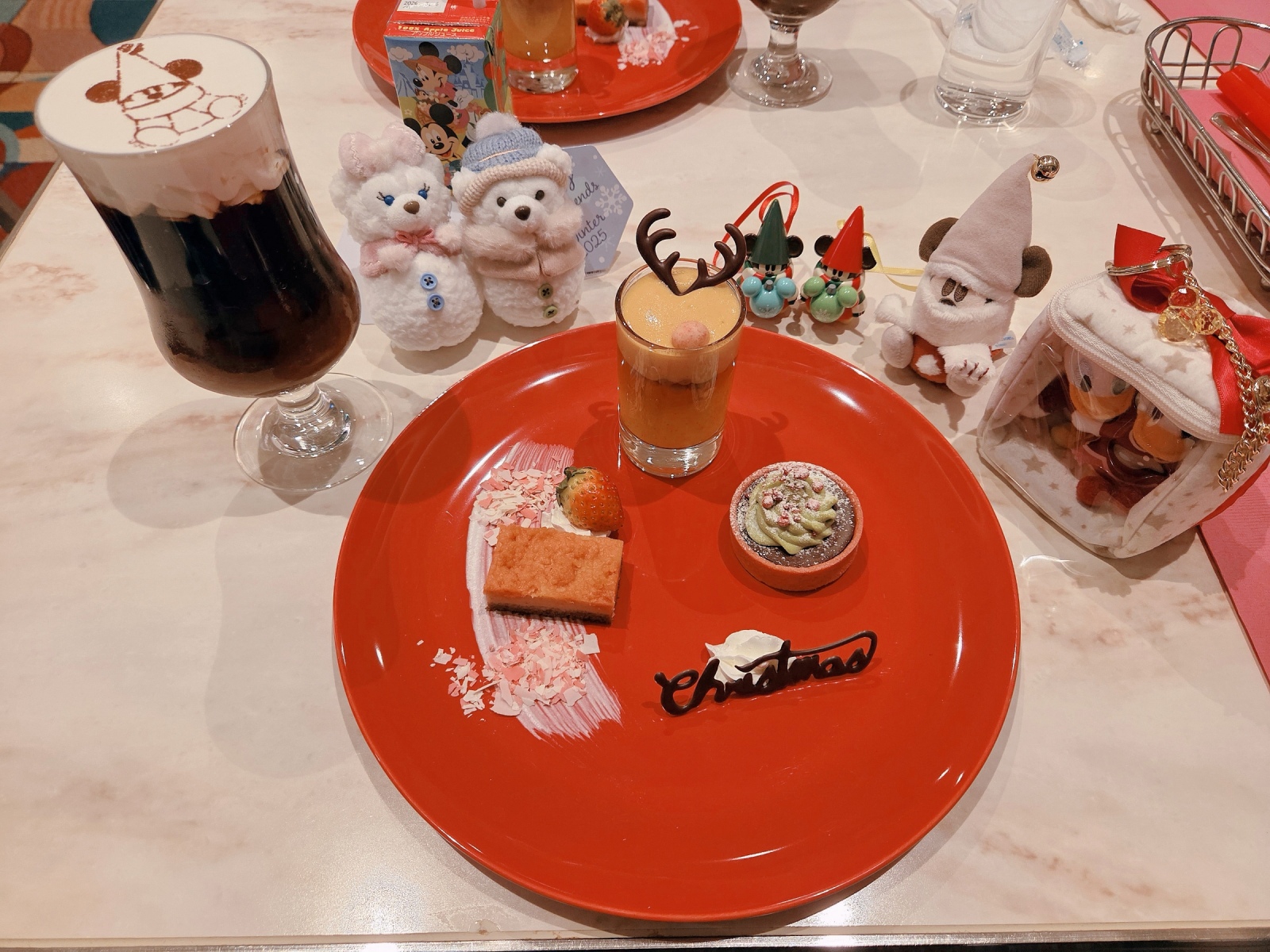 ディズニー・クリスマス2025。 センターストリート・コーヒハウスで時間限定で提供中のデザートプレート🎄🔔プレートにはストロベリーチーズケーキ、オレンジと紅茶ゼリーのヴェリーヌ、チョコレートタルト ピスタチオクリーム添えが乗っていてアイスカフェモカ(クラッシュコーヒーゼリー入り)が付いてきます。カフェモカのアートはリルリンリンだよ🔔可愛い〜🩷チョコレートタルトはクリスマスツリーをイメージしてるのかな?ヴェリーヌはトナカイよね。ゼリーのオレンジは果肉入り🍊ストロベリーチーズケーキはしっとりめ。3品とも美味しかったよ〜❣️