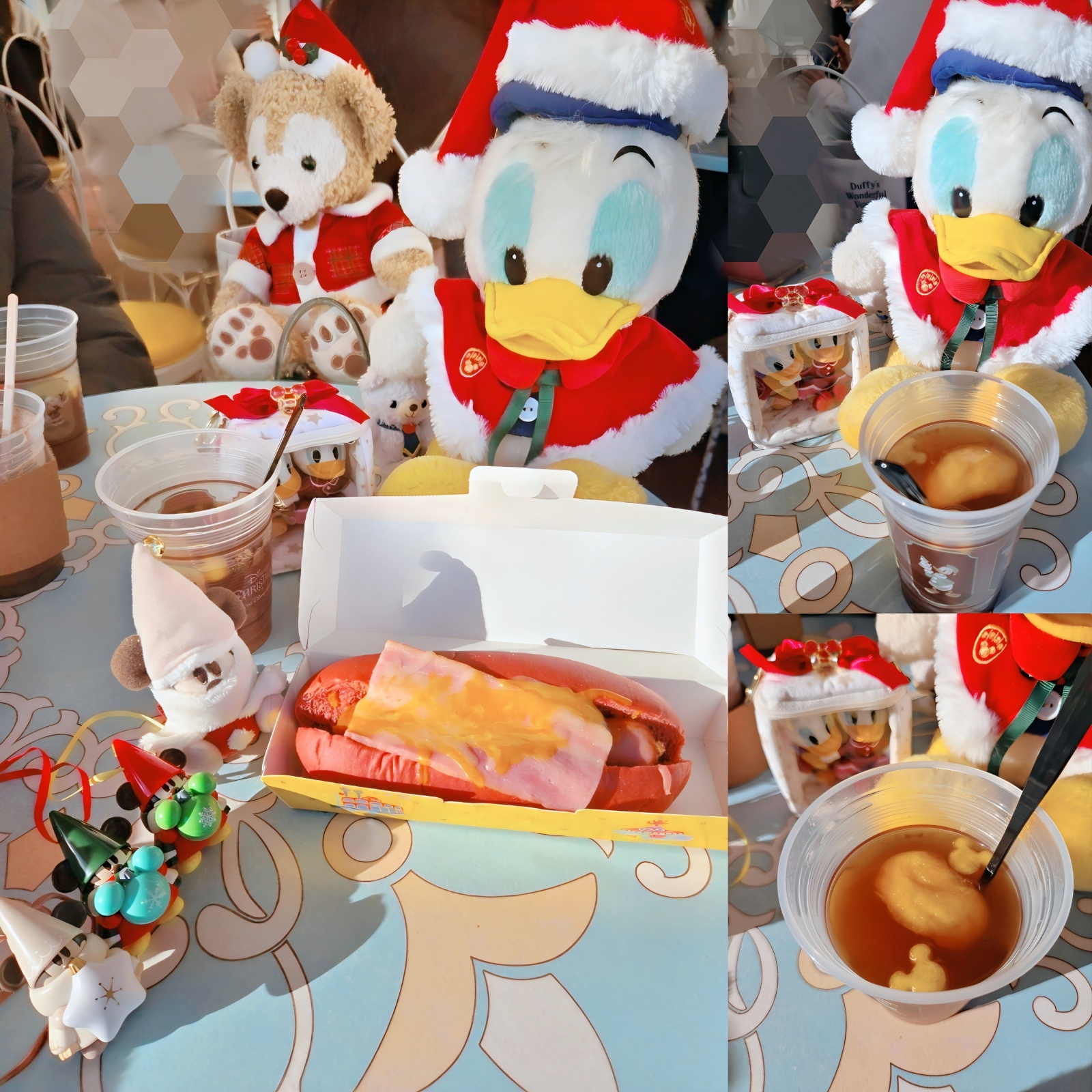 ディズニー・クリスマス2025。 ホットアップルジンジャードリンクとリフレッシュメントコーナーで提供中のグラタンドッグ🎄ホットアップルジンジャードリンク温まる〜😊ミッキーシェイプのアップルと大きめなドライアップルが入ってます🍎グラタンドッグはサンタカラーのパンにソーセージ、上にモルネーソース、ベーコン、チェダーチーズが乗ってるんだけどモルネーソースがクリーミーで美味しかった🩷