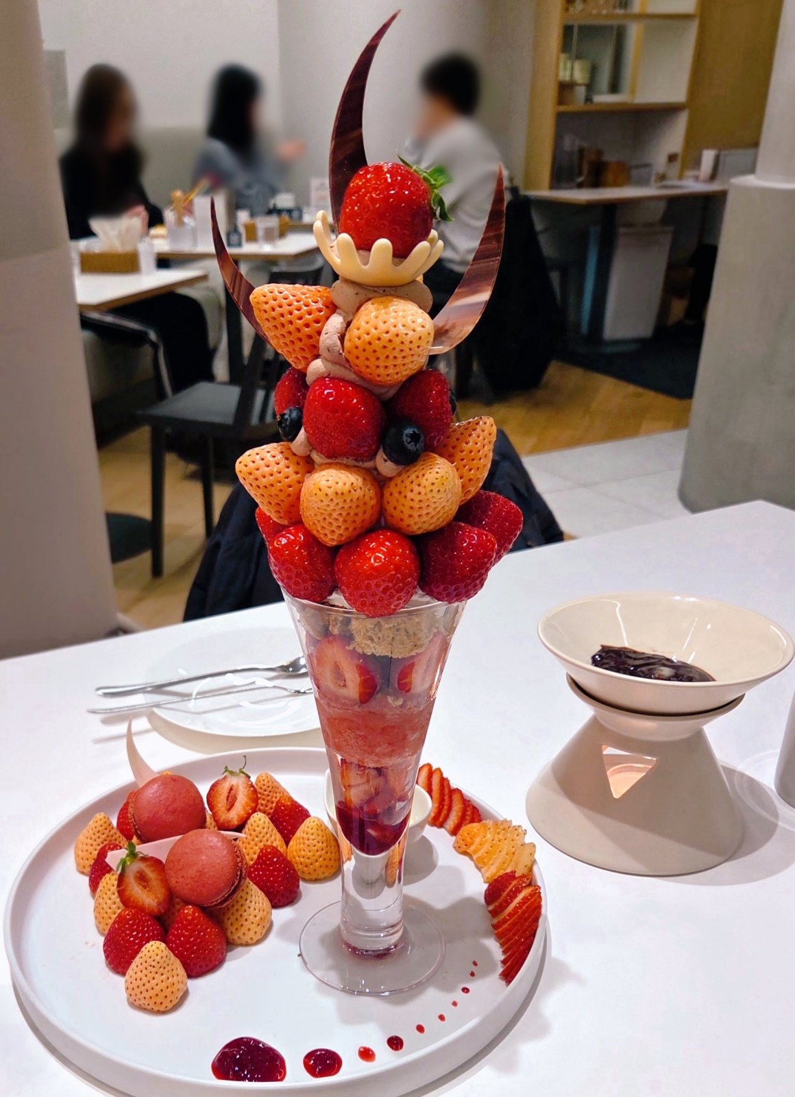 フルーツピークス。 誕生日月は20%オフと教えてもらったのでStrawberry Holic〜いちごに夢中〜を食べてきた😊あまおうと淡雪がふんだんに盛りつけられていてパフェの方は中にバニラアイス、チョコアイス、苺のシャーベット、ブラウニーなどが入っていて飽きずに食べれます🩷またね、チョコホイップがチョコチップ入りで美味しいの🫶味変できるように練乳とチョコフォンデュが添えられてたよ🍓🍫美味しかった〜❣️