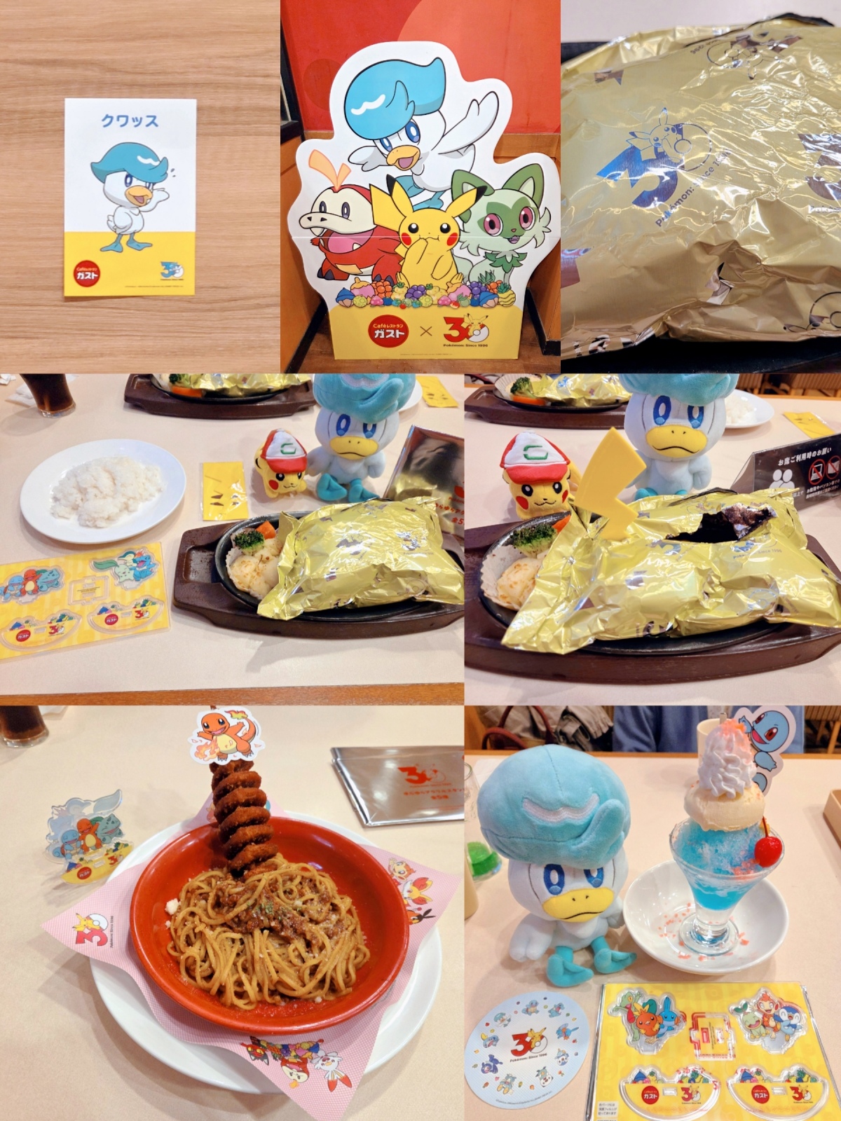 ポケモンコラボメニューを食べてきたよ⚡ガスト行くのコロナ前が最後だったからチーズINハンバーグが小さくなってて驚いた😳ホイル包みだからかな?ピカチュウのしっぽカッター可愛い💛ホイルは30周年柄です👏足りなくてヒトカゲのミートソースパスタも注文。ヒトカゲのひのこのおかげでこんがりしたトルネードポテト付き🔥こういうの面白いよね。デザートはゼニガメのかき氷サンデー🌊付いてくるパチパチあめを振りかけていただきます。あめ全部かけたからずっとパチパチ音してた🤭アクスタはパルデア出なかったのでみずポケモンが揃ったコースターを大事に持って帰りました🩵あとね、パネル撮ってたら夢の国でもポケセンでもないのに店員さんがパネルと一緒に撮りましょうか?って声をかけてくださって嬉しかった😊