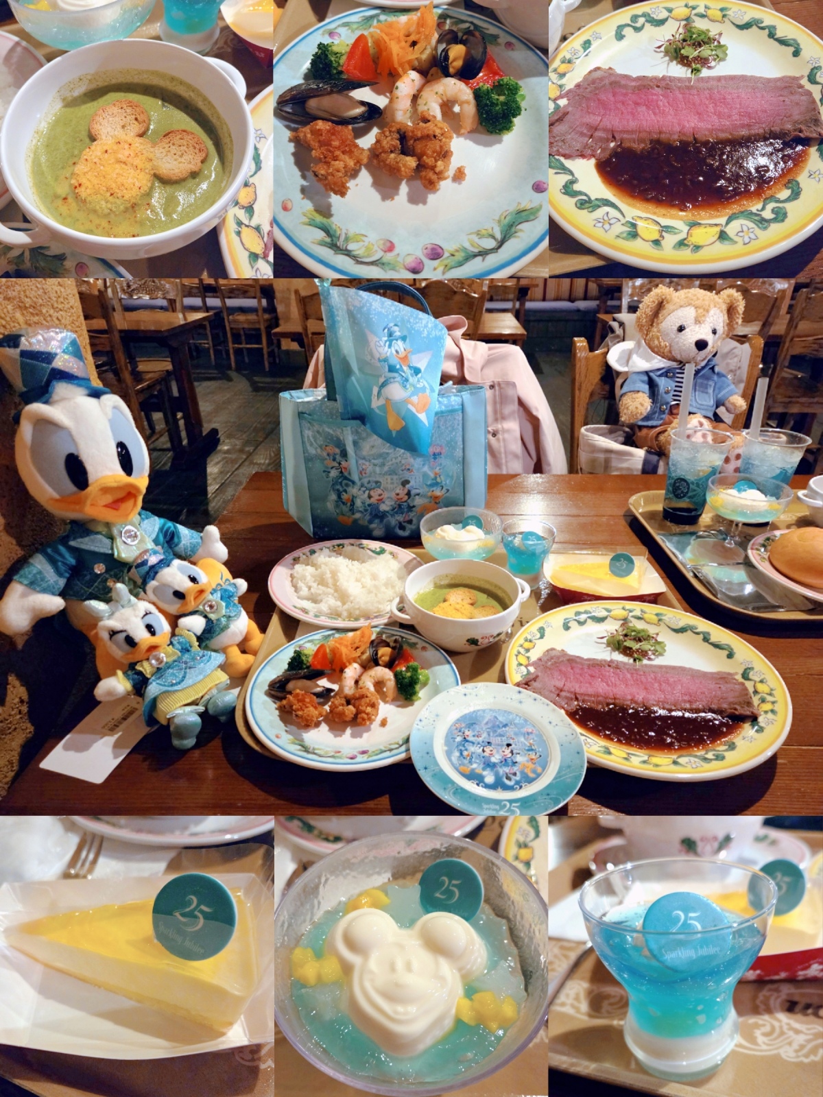 カフェ・ポルトフィーノで食べたスペシャルセットなど💎スペシャルセットの内容はタコのフリットとシーフードサラダ、ほうれん草とパンチェッタのクリームスープ、ローストビーフ マッシュルーム入りデミグラスソース、パンナコッタ、ライチー&マンゴー。スープはミッキーラスクの上に何だったか忘れたけど乗ってて、それが良いアクセントになってた記憶。ローストビーフ美味しかった🫶ドリンクはレモネード(ブルーシロップ&バタフライピー)。くし切りのレモンが入ってたよ🍋ランダムのコースターはミキミニだったのでまたリベンジしたい❤️🔥