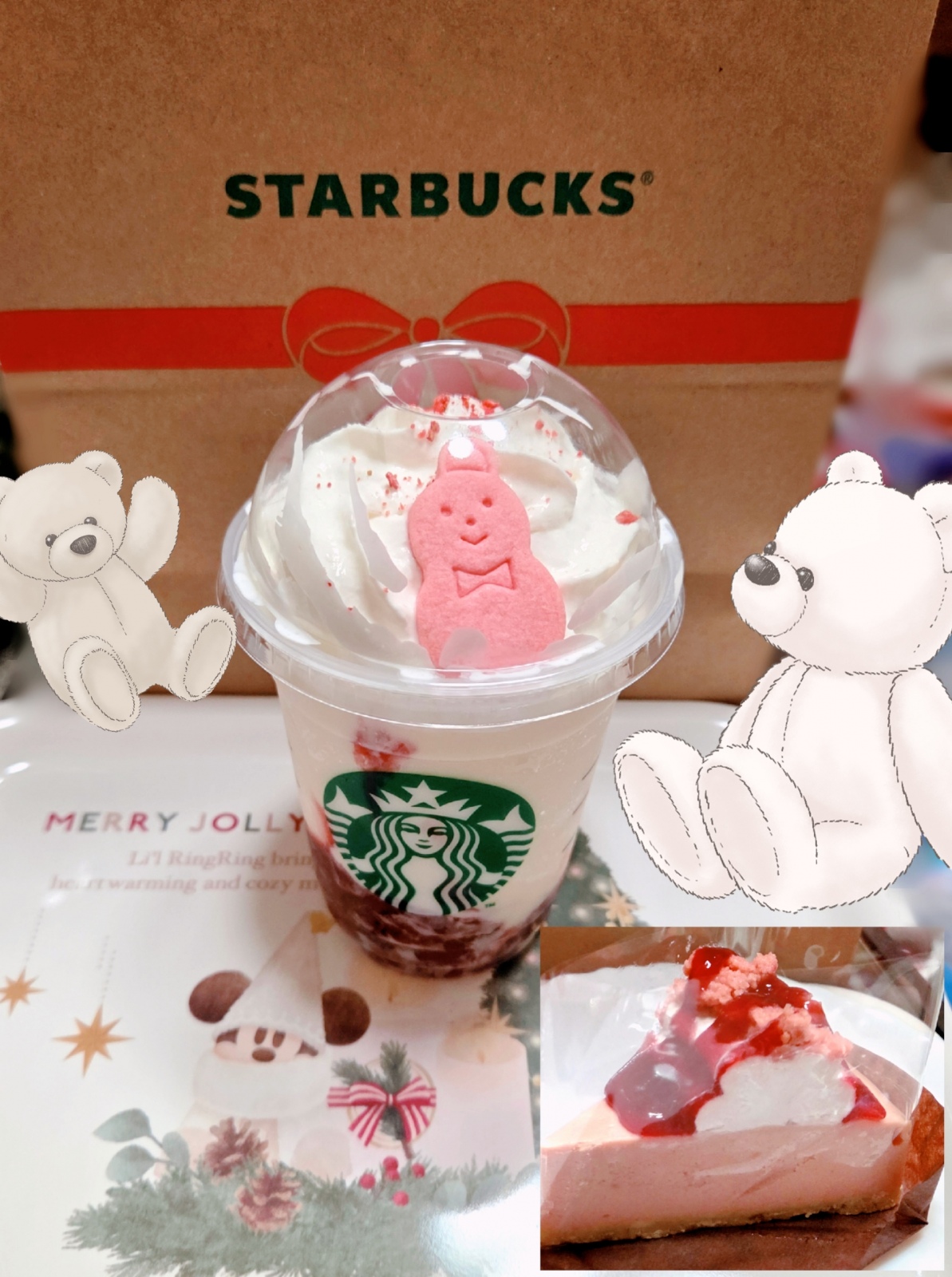スタバのストロベリー&ジョイフルメドレーティーフラペチーノ🍓🎄紅茶・ウーロン茶・ジャスミン茶の3種をブレンドするとこういう味になるのか〜と。いちごの果肉がたっぷりで美味しかった🥰クッキーをトッピングしたら雪だるまだったよ☃️可愛い〜🫶リボンはマストなのかと思ったら違うんだね〜。