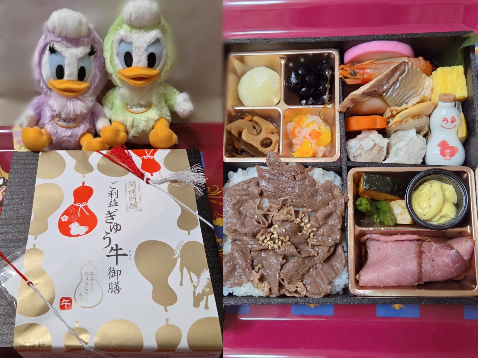 明けましたね🎍🎍崎陽軒で予約して買った開運祈願 ご利益ぎゅう牛御膳おべんとう🍱国産牛モモ肉のすき焼き風煮とローストビーフの白だしマリネに惹かれて予約したんだけど美味しかった🥰ひょうちゃんのおみくじは吉でした🫶2026年何事もウマくいく年になりますように🐴ウマいものいっぱい食べれる年になりますように🩷